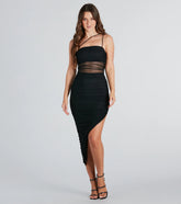 A-List Curves Mesh Bodycon Midi Dress - BLACKShow off your A-List curves in this mesh midi dress to make every VIP list! This midi-length dress features a sleeveless square neckline, adjustable spaghetti straps, side ruched seams and bodycon silhouette, and an asymmetrical high-side slit along the hem. Complete the look in...