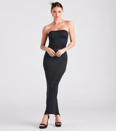 Casually Chic Smooth Knit Fitted Maxi Dress - BLACKThis smooth knit fitted maxi dress is the casually chic style you need to elevate your 'fits. It features a strapless straight-across neckline, an all-over curve-hugging silhouette, a maxi-length hem, and a trendy back slit accent. The smooth knit fabric includes an airy sheer...