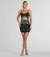 Glitzy Cutout Rhinestone Mesh Mini Party Dress - BLACKBring the glitz to your next night out in this rhinestone mesh mini party dress! Designed with a stretchy sheer mesh fabric with a knit lining, the mini-length dress features all-over rhinestone embellishments in chic asymmetric designs for a gorgeous glam vibe. The sleeveless...