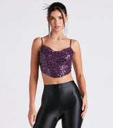 Striking In Sequin Open Back Top - PURPLECreate a striking look in this sequin crop top for a night out! It features a sleeveless cowl neckline, spaghetti straps, cropped hem, and an open back with tie closure. The top is composed of a lined sequin mesh knit fabric with minimal stretch....