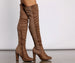 Step out and command the room with trendy boots that make a bold statement! The boots feature an over-the-knee fit, an inner zipper closure, a pointy toe, and a block heel. The boots are composed of a half faux suede and half knit composition. Complete look with a sweater dress and statement earrings.