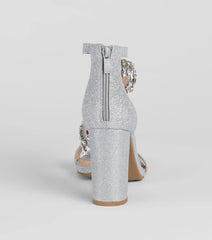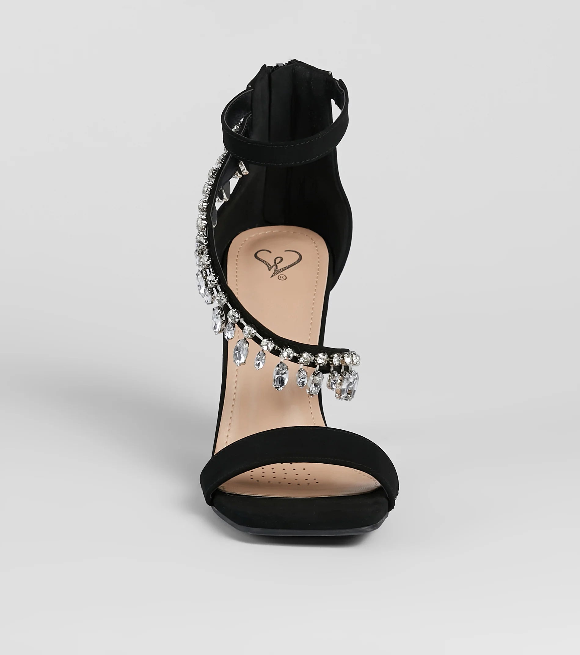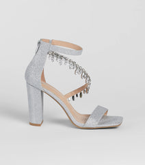 Have a moment of luxe with these gorgeous embellished block heels. They feature an open square-shaped toe with a strap, an asymmetric strap across the foot with a glam chunky rhinestone fringe design, an ankle strap, a closed back with a zipper closure, and a block heel. The black heels are faux nubuck and the silver heels are woven glitter. Style with a sparkly clutch.