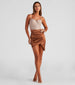 Have a chic night in this satin mini skirt designed to flaunt your curves in a flattering, high-rise elasticized waist, asymmetrical wrap front, and bodycon silhouette. Complete your party look in a bustier and strappy heels.