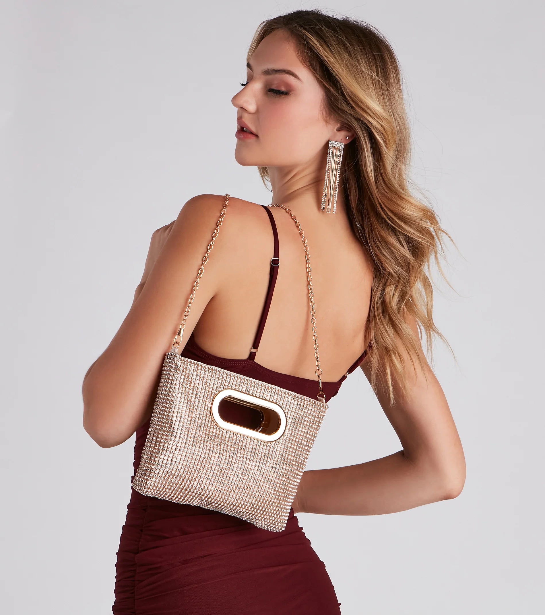 Your outfit could use a ray of shine with this rhinestone clutch handbag! It features a detachable chain strap, metal trim embedded handles, all-over rhinestones, and a spacious interior for keeping your essentials safe. Complete the look with fringe earrings.