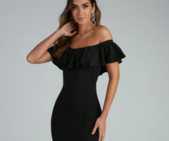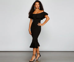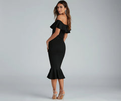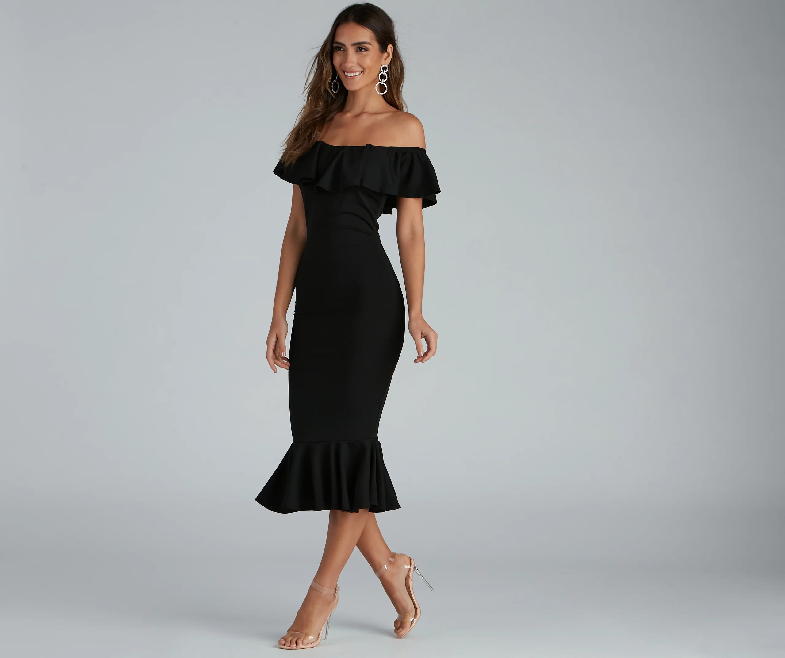 Make a dramatic entrance with a midi dress that is perfect for your cocktail event. The dress features a ruffled off-the-shoulder neckline a bodycon fit, and a midi length silhouette with a ruffled hem. The dress is composed of a crepe fabric that offers a form hugging fit with a moderate stretch. Complete look with stiletto heels and statement earrings.