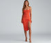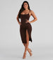 Bring a stylish twist to your look with a sleek midi dress that slays! The dress features a sleeveless scoop neckline, spaghetti straps, a high side slit with a twist knot accent, and a midi-length silhouette. The dress is composed of a smooth knit fabric that offers a form hugging fit with a moderate stretch. Complete look with clear PVC heels and a faux leather clutch.