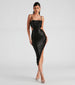 You're the real star of the show in this sequin midi dress featuring a sleeveless square neck, adjustable spaghetti straps, side and back cutouts, a form-hugging silhouette, and a sultry side slit. Complete your dazzling look in stiletto mules.