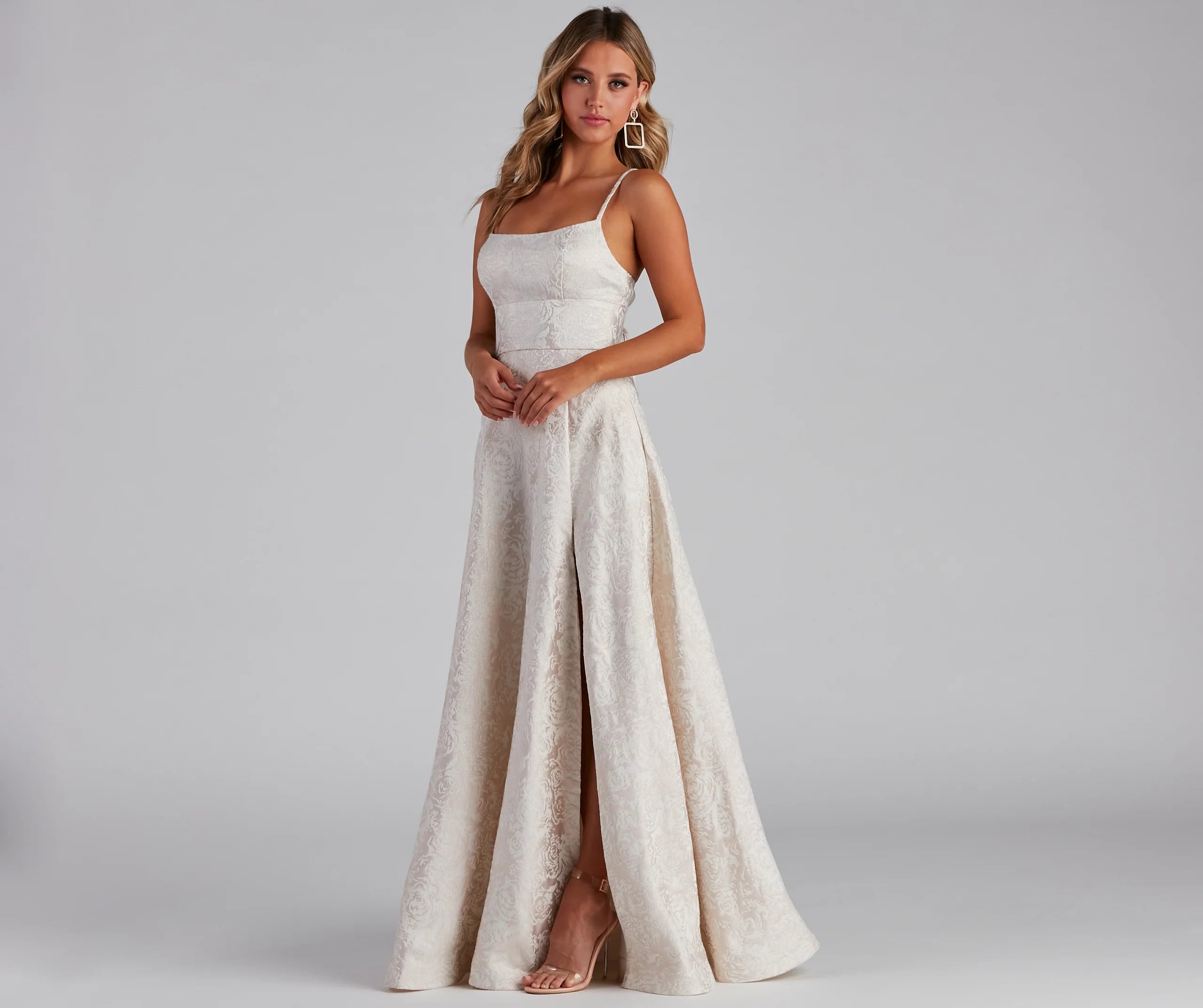 Create an enchanting homecoming or prom look that radiates elegance and grace in our Adalyn brocade dress! She features a classic scoop neckline, padded cups, spaghetti straps that lead to a cross-back lattice design, a high waist seam, and a flowy, floor-length, A-line silhouette with a high slit. The dress is composed of a lined textured woven knit fabric with a minimal stretch. Her brocade print elevates and pairs beautifully with gleaming rhinestone jewelry and sleek stilettos.