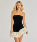 Bring the flirtatious allure in the Addie velvet ruffled mini dress perfect for your next party! The short formal dress is designed with a strapless straight-across neckline, vertical seams that run from bust to hem, and a tiered, ruffled, asymmetric hem for that dramatic flair.