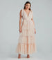 Make an enchanting regal entrance at your next black-tie affair in the ethereal and chic Adele formal dress! She features a sleeveless plunge V-neck and back with a surplice design, tank shoulder straps with adorable tie-shoulder bow accents, and a stretchy smocked high waist with a matching tie-front belt. Her floor-length hem features a stunning tiered ruffled design with a flowy A-line silhouette. The airy sheer tulle fabric features all-over faux pearl embellishments for the prettiest touch of glamour, and includes a full-length lining. Complete your look with a rhinestone lariat necklace and clear heels.