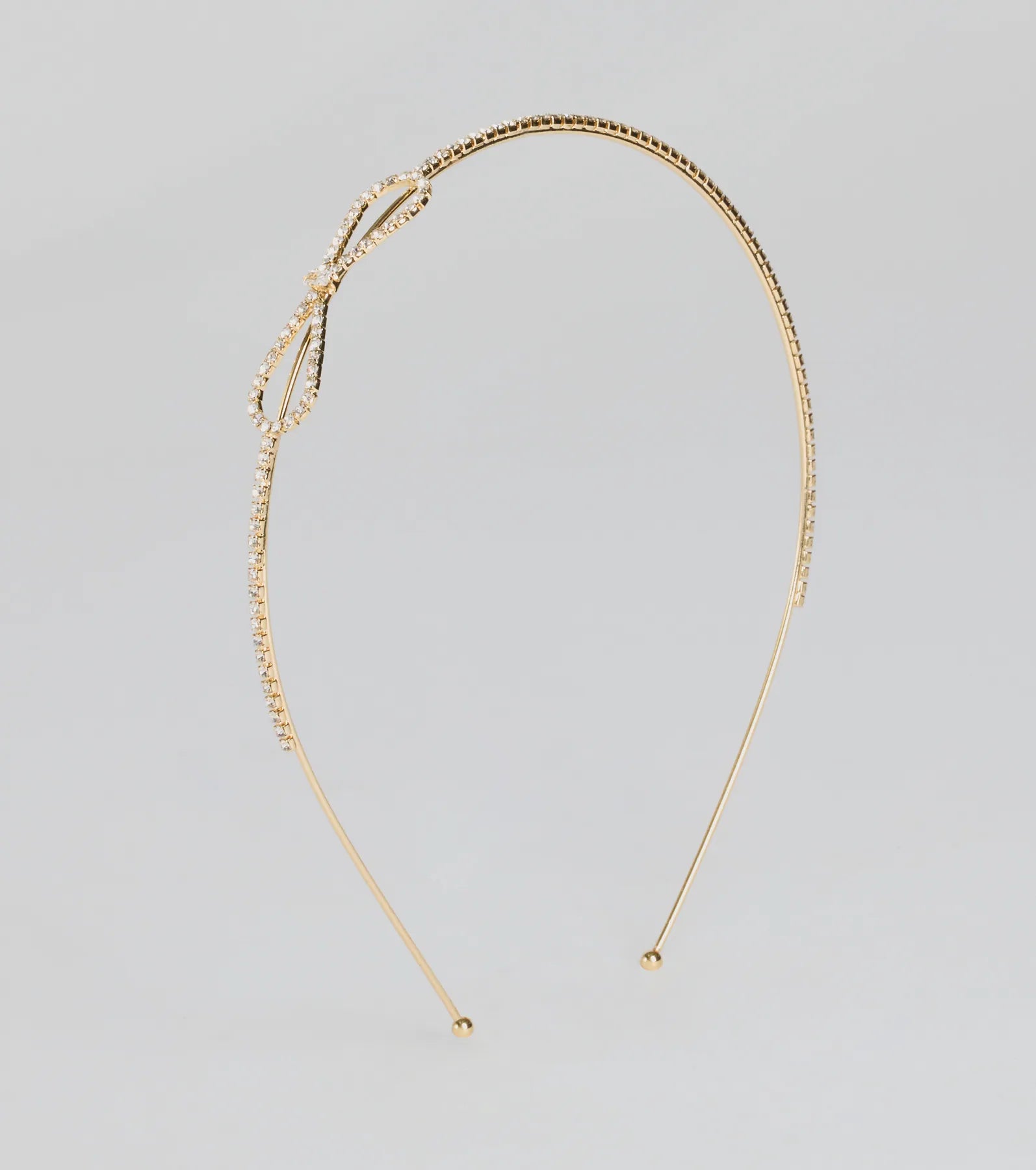 An adorably glam headband showcasing a rhinestone embellished band with a bow accent to dress up your everyday style.