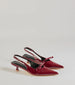 Adorable and chic, these sleek patent faux leather pumps feature a closed pointed toe, a bow accent strap, an adjustable sling-back strap, and a short kitten heel. Style with an oversized blazer.