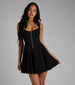 Adorably trendy, this short skater dress gives off that sweet and sassy vibe. The bustier bodice features a sweetheart neckline and zip-front design, leading to a pleated skater silhouette.
