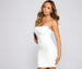 Hit up those after-parties with a wowing mini dress that creates a head-turning impression! The dress features a sleeveless square neckline, sleek bungee spaghetti straps, a ruched body, and a mini-length silhouette. The dress is composed of a double-lined buttery smooth fabric that offers a form-hugging fit with a moderate stretch. Complete look with a clutch and neon heels.