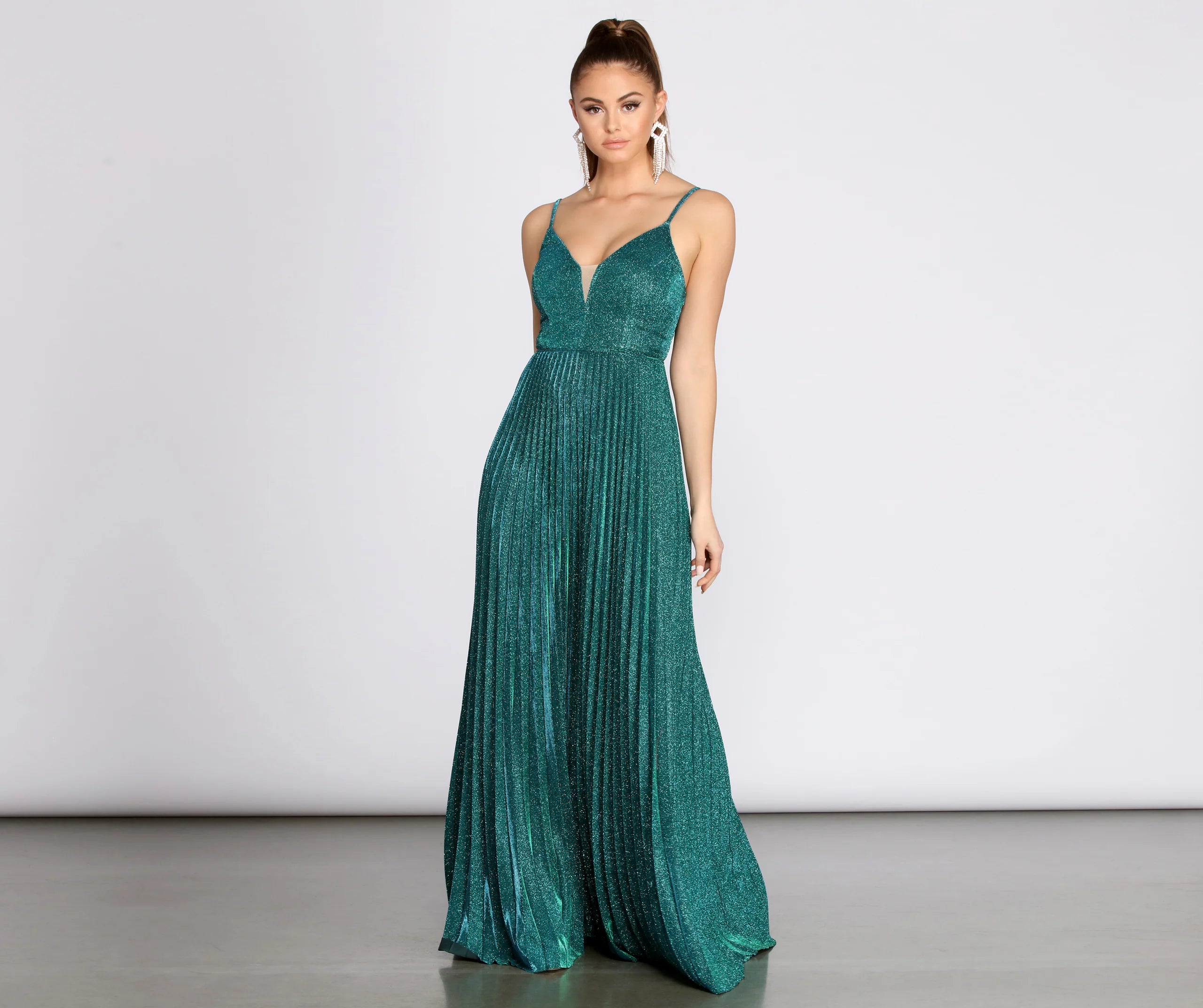 Let your presence be known as soon as you step foot in our gorgeous Aida! Crafted from woven glitter fabric, everyone will be stunned as she changes hues in the light. Her pleated floor-length skirt adds dimension and ease as you glide and dance through the night! Be sure to pick up an envelope clutch to store all your essentials!
