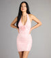 Made for a head-turning arrival, the Aleena sequin mini dress brings soft glam with high-impact shine. Designed in a sequin-covered stretch fabric, this bodycon mini features a halter V-neckline and an eye-catching floral accent that feels both flirty and elevated.