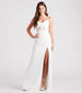 Create a captivating moment with a formal dress that brings elegance to your evening soirees! Alexia features a sleeveless V-neckline with a padded bust, adjustable spaghetti straps for a customized fit, a contrast sheer mesh bodice, ruching, and a floor-length A-line silhouette with a high slit. The formal dress is composed of a lined crepe fabric with a moderate stretch. Complete the look with rhinestone heels and a clutch.