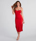 Add seriously sexy allure in the Alianna formal midi dress to spice up banquets or celebrations! She features a sweetheart bustier bodice with a built-in padded underwire bust eliminating the need for a bra, adjustable spaghetti straps, and a flattering bodycon silhouette with a side slit. The formal midi-length dress is crafted from a sleek knit-lined fabric that fits like a glove and offers plenty of stretch. Complete the look with a glam purse and lace-up heels.