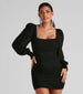 Make the night all about you in this alluringly chic mini dress! It features a square neckline, ruffled shoulder accents, long sheer chiffon peasant sleeves with smocked hems, a mesh bodycon silhouette with ruched detailing down the sides, and a mini-length hem. Style this mini dress with strappy stilettos.