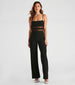 This sleeveless jumpsuit is the real stylish deal! It features a square neck, spaghetti straps, a mesh striped bodice, and a straight-leg silhouette. Complete your sultry look with a statement choker for cocktail hour!