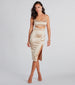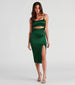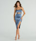 Get ready to have all eyes on you in this attention-grabbing midi dress! Featuring a sleeveless scoop neckline, spaghetti straps, a bold front cutout at the waist, and a bodycon silhouette with a high front slit, this sleek satin midi-length dress will hug your curves. Complete the look with clear heels.