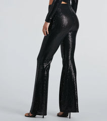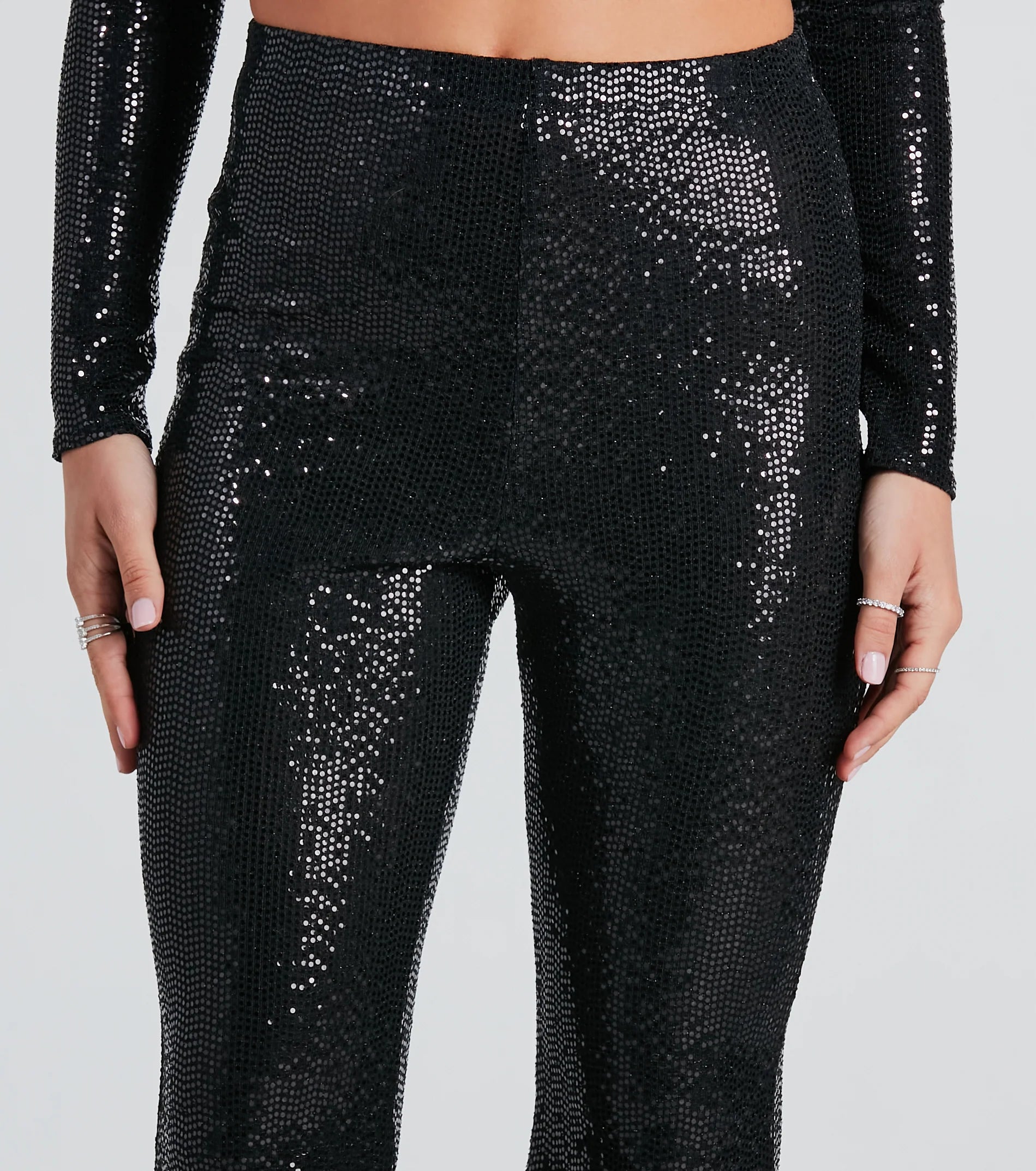 Get dressed all in sequins! These sparkly pants feature a flattering high-rise waist, a hip-hugging fit, and a flared hem on sequin knit fabric that brings the perfect shimmer. Complete the look with the matching top for a party!