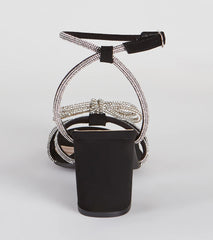 With these sparkling rhinestone bow low-block heels, it's all about that glitz and glamour! They feature an open almond toe, a thin strappy design across the foot with mini rhinestone embellishments and a chic rhinestone bow accent, adjustable ankle and heel straps with matching rhinestones, and a low block heel for comfortable wear. Style with chandelier earrings and a sleek clutch!