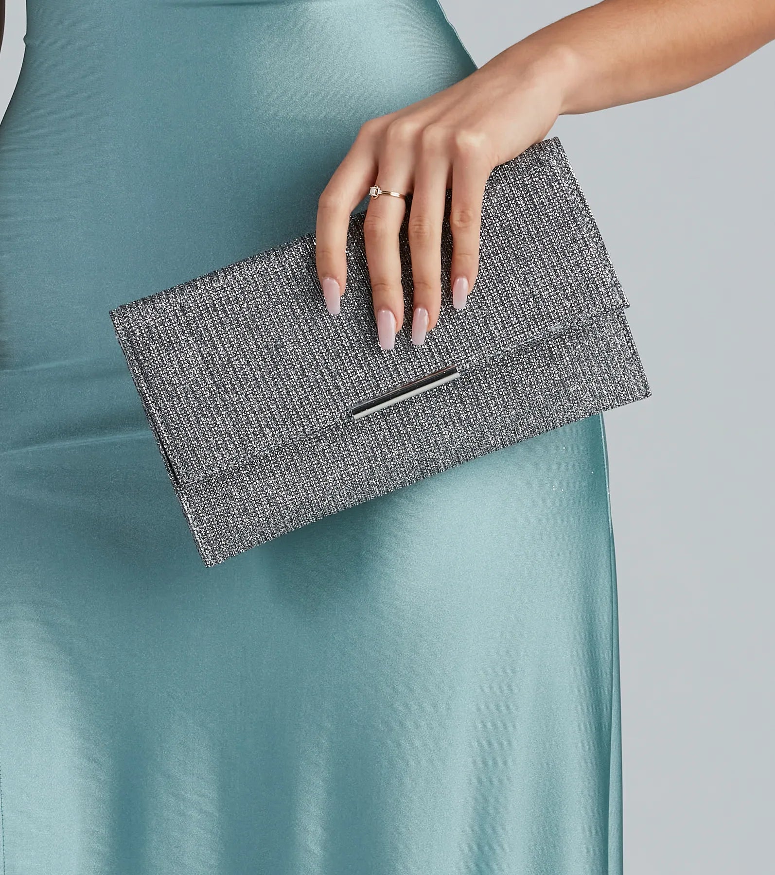 Bring the shine and more with a clutch that glows! The clutch features a large rectangular body, a fold-over closure with metal trim and snap button, and a glitter mesh body. The interior features a double compartment design and a detachable chain shoulder strap. Complete look with a formal satin dress.