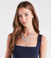 All that sparkles will be you in this glam necklace and earrings set! The necklace features a V-shaped design with a two-row mini rhinestone layer and a leaf-shaped rhinestone embellished layer. The matching earrings are designed with two rows of mini rhinestones in a linear silhouette. Complete the look with faux lashes for a special occasion!