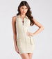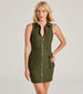 Capture all the attention in this structured and chic cargo mini dress! It features a sleeveless collared neckline, a complete zip-front design creating a V-neckline, a faux belted waist, large cargo-style side pockets, a mini-length hem, and a streamlined form-hugging fit. The woven fabric offers minimal stretch. Style this mini dress with hoop earrings and clear heels.