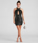 Bring all the glitz and glamour to your Homecoming look with this alluring mini dress! It features a sleeveless halter neckline with a cross-front design, a sultry front keyhole cutout, and a short, curve-hugging, bodycon silhouette. The lined mesh fabric features all-over sequin embroidery for a stunning sparkle. Style with rhinestone duster earrings and clear heels.