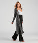 The more glitz and glam, the better! This sequin duster is perf for the holiday season. It features long fitted sleeves, an open front, a long, flowy, relaxed silhouette with side slit accents, and all-over sequin embroidery for the prettiest shine. The lined knit fabric has minimal stretch. Layer over a bodycon dress for a holiday party.