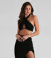 Showcase your alluring beauty in this on-trend crop top. It features a sleeveless halter neckline with a cross-front design, a center cutout at the bust, an open back, and a majorly cropped fit. Style with the matching midi skirt and heels for a girl's night out.