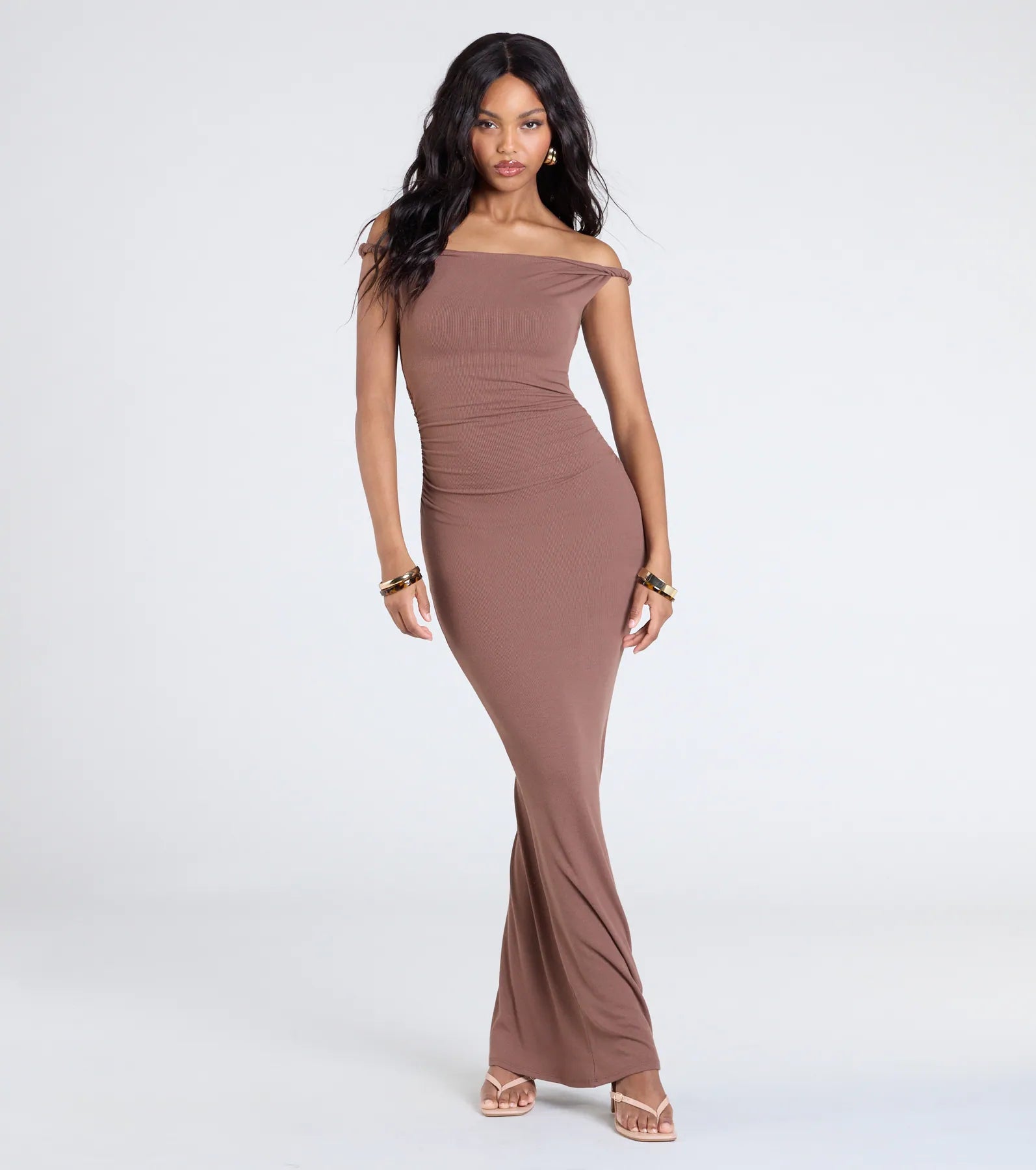 Show off your alluring curves in this off-the-shoulder maxi dress crafted from a rib knit fabric that fits like a glove!
