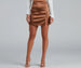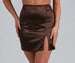 Alluringly chic, this sleek satin mini skirt is a trendy must-have. It features a flattering high waist, a side slit, and a short, curve-hugging fit. Style this skirt with an adorable bustier top and clear heels.