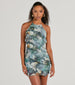 You'll look positively eye-catching in this floral mini dress at weddings or garden parties! The halter crew neckline and open back ooze elegance, while the ruffled bodycon silhouette flatters your curves. With a mini-length hem, this dress is perfect for any occasion. Complete the look with earrings.