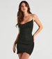 With this slinky knit mini dress, you'll always be invited to the party! It features a sleeveless cowl neckline with sparkly rhinestone straps, a bodycon silhouette, and back ruched seams to accentuate your natural curves! Complete the look in glam strappy heels.