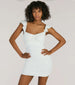 Make your sweet impression in this eyelet lace mini dress detailed with ruffled straps and an adorable ruched neckline. The form-hugging fit will highlight your stunning curves.