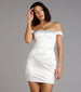 Sleek and striking, the Amber satin mini dress stuns with an off-the-shoulder neckline and artful front twist detail. The bodycon silhouette is designed to flatter, making it an elegant style for brides to any celebration where you want to shine.