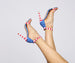 Show up to your Fourth of July party in style in these trendy stiletto heels! They feature an open almond-shaped toe, a thin toe strap, a thin adjustable ankle strap, a sleek stiletto heel, and an all-over Americana print. Complete the outfit with a casual white dress and hoop earrings.
