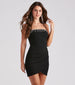 Amp up the sparkle for your next night out in a mini dress that brings elevated glamour! This dress features a sleeveless square neckline with an eye-catching rhinestone fringe trim, adjustable spaghetti straps, front pleated detailing, a mini-length hem with a faux wrap-front design, and a bodycon silhouette. The lined crepe fabric offers a moderate stretch. Style with rhinestone heels.