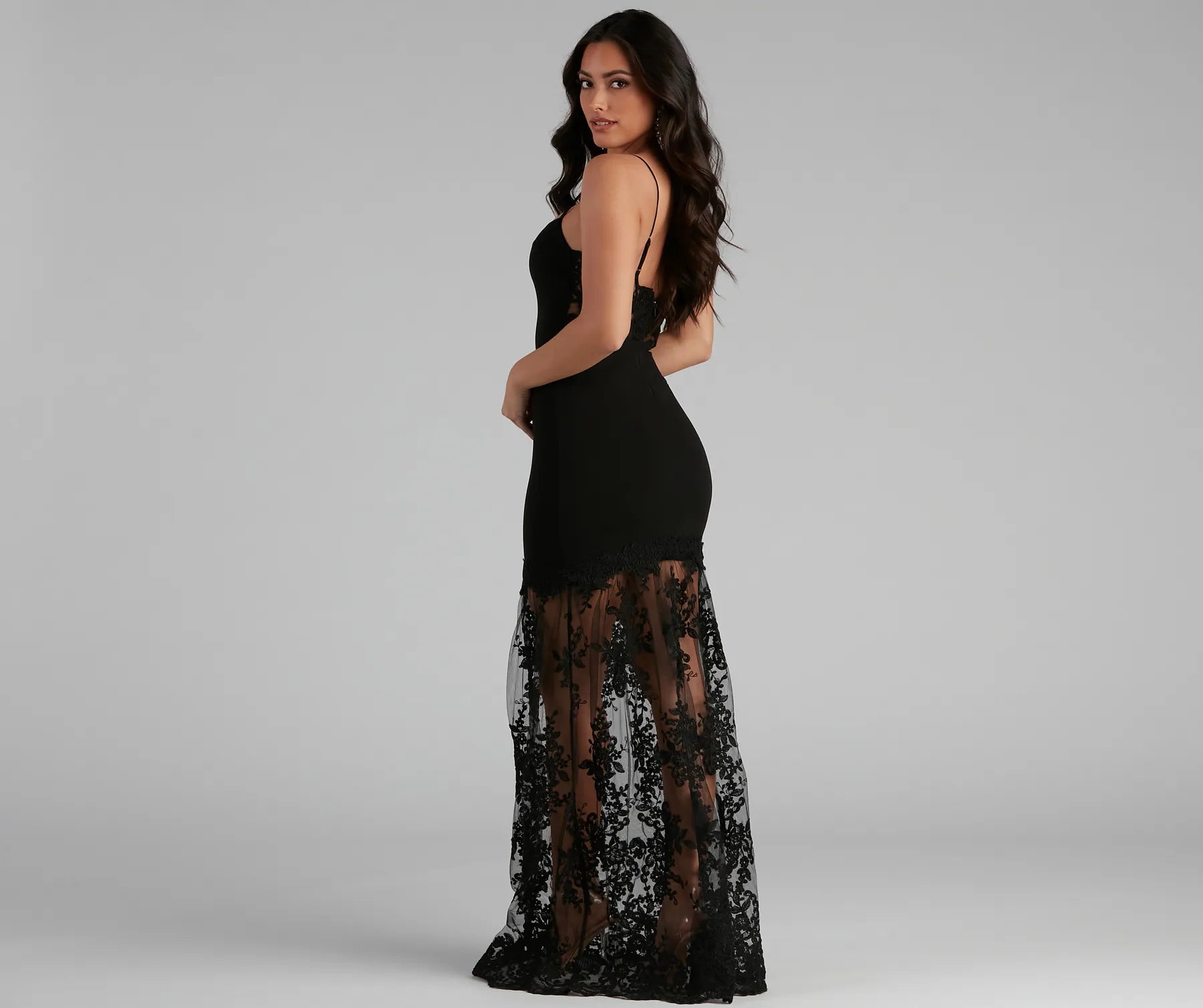 Anahi brings sophistication to the party in a floor-sweeping mermaid silhouette that's sure to catch everyone's eyes. She features a sleeveless, square neckline and adjustable straps on a fitted bodice. It flows into a detachable floral lace skirt that you can remove to convert her into a sultry mini dress for all-night dancing. The dress is composed of a combination of crepe and lace fabric with minimal stretch. Complete your chic look with a glamorous necklace set.