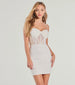 Cause sparkling commotion at your next formal party in the Andi heat stone corset dress! Stun the room in this sleeveless bodycon dress featuring a sweetheart neckline, adjustable spaghetti straps for a customized fit, a corset-style sheer bodice with flexible boning, and side ruched seams along the bodycon silhouette. The partially lined mesh fabric features all-over mini heat stone embellishments. Complete your sultry look with a rhinestone fringe hair accessory.