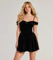 Elevate your formal outfit in a luxe velvet short dress featuring an off-the-shoulder collared sweetheart neckline, adjustable spaghetti straps, a drop-waist design, and a pleated skater silhouette. Complete the outfit with glitter mesh heels.