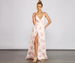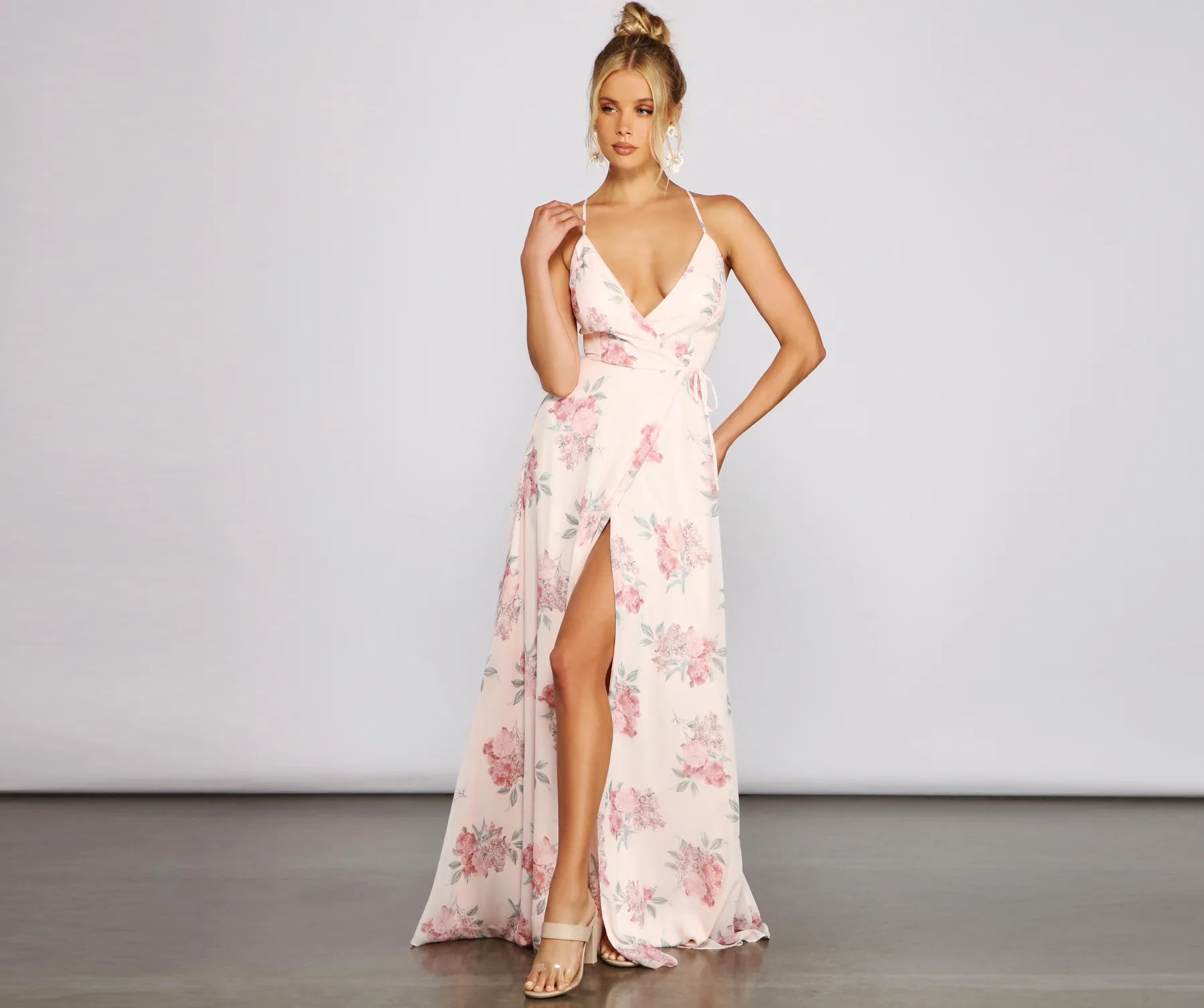 Showcase flirty vibes for your next brunch date in the Anna floral chiffon dress! She features a sleeveless bodice, adjustable spaghetti straps that cross in the back, a wrap front padded V neckline, and a back zipper and hook and eye closure. Her high waist has a tie detail and leads to a flowy, floor-length A-line silhouette with a wrap front design. The dress is composed of sheer chiffon fabric with an all-over pretty floral print and a knit lining. Style this dress with a rhinestone lariat necklace and adorable wedges.