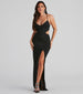 Showcase your elegant style with a formal dress that dares to be bold. Ara features a sleeveless V-neckline, spaghetti straps that lead to the open strappy back, and dual waist cutouts. Her bodycon silhouette is accented with a high side slit along the floor-length hem. Ara is composed of a lined crepe fabric that offers a moderate stretch. Complete formal outfit with rhinestone heels and a sphere clutch.