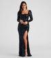 Everyone will do a double-take when you walk by in the Arial formal sequin dress perfect for your next fancy event! She features long sleeves, a square neck, and a lace-up open-back with tie closure. Her form-hugging mermaid silhouette leads to the floor-length hem with a high-cut side slit to show some leg! The formal dress is composed of a sequin mesh-lined fabric with minimal stretch. Complete your dressy look with glam earrings and heels.