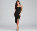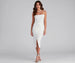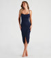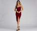 A formal midi dress is the perfect go-to for that upcoming cocktail affair or as a wedding guest. Wow in the captivating Ashlyn dress features a flattering cowl neckline, spaghetti straps that lead to a cross-back design, and a high waist seam. She's designed with a gorgeous wrap bodycon silhouette with a front slit accent and a midi-length hem. The dress is composed of a lined crepe fabric with a moderate stretch. Complete your formal outfit with rhinestone heels and a tennis bracelet.