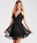 The party-perfect Astrid mesh skater dress pairs well with crowns and selfies! She features a sleeveless V-neckline, adjustable spaghetti straps that cross in the back, a pleated and padded bust, a pleated high waist with flexible boning inserts for a snatched look, and a flattering skater silhouette with a ruffled bonded short-length hem. The party dress is composed of a mesh fabric with a stretchy knit lining. Complete the look in a pair of glamorous heels for a school dance or banquet!