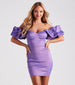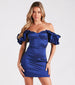 The Azalai satin short dress brings flirty allure with voluminous fun! She features an off-the-shoulder, sweetheart neckline with non-slip grip lining, ruffled elasticized sleeve cuffs, a padded bust, and a form-hugging short-length hem. The formal mini dress is composed of a metallic-like taffeta woven fabric with minimal stretch and a lined bust. Style with stiletto heels and a clutch to complete the look!